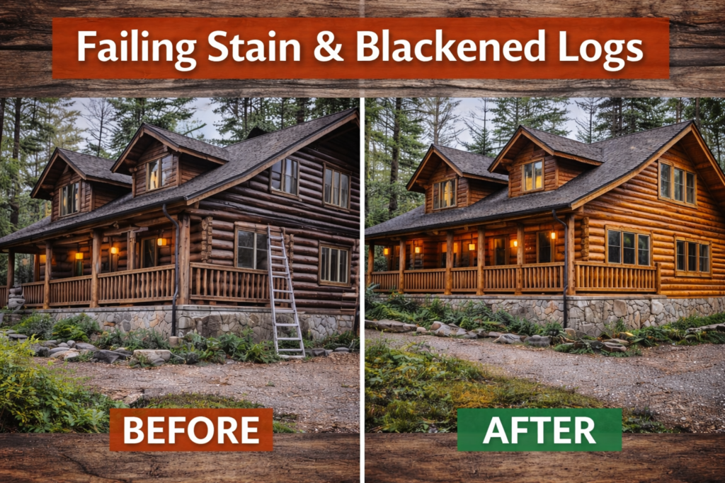 The log home had heavy black staining, faded color, and peeling stain — especially on shaded walls. Moisture was being absorbed into the logs, increasing the risk of rot.