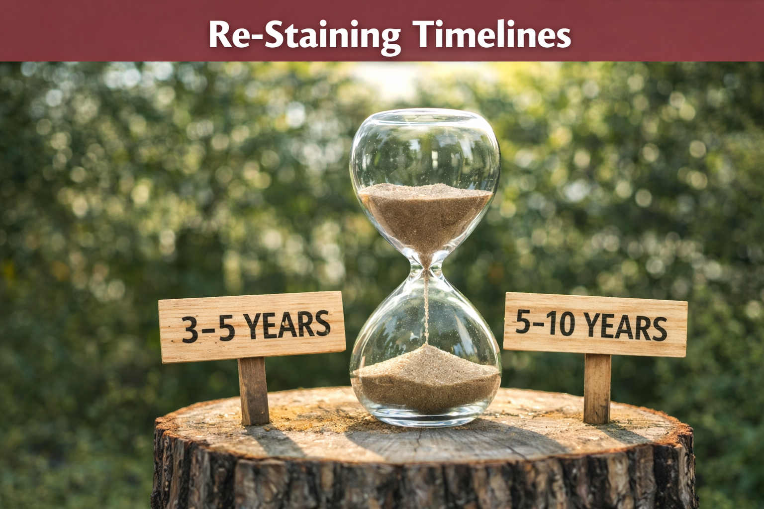 - Full re-stain: typically every 5–10 years, depending on exposure and stain system